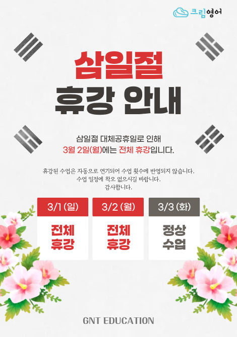 3/1(일), 3/2(화)은 삼일절과 대체공휴일로